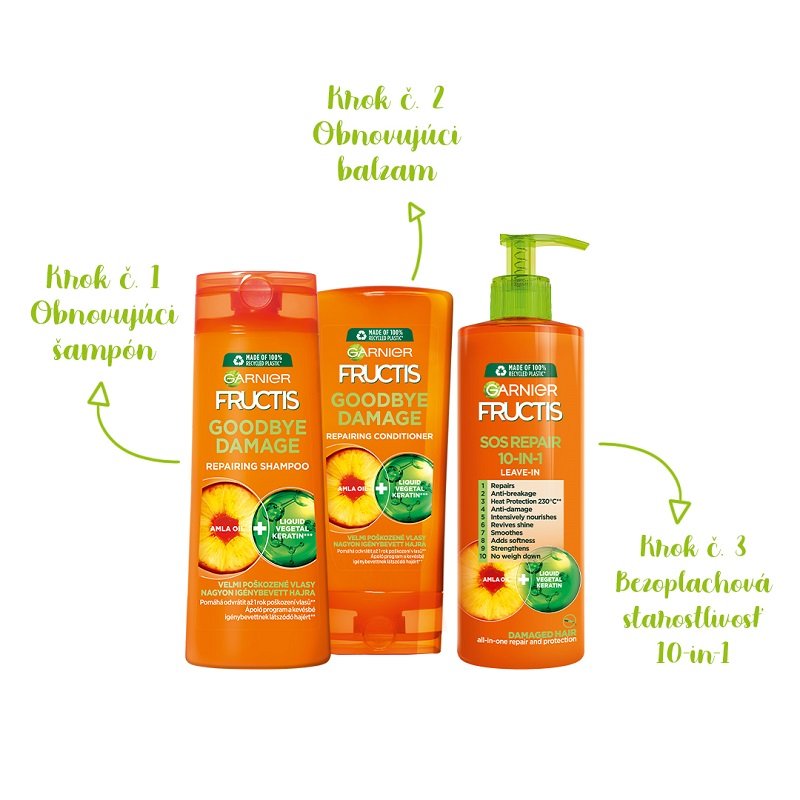 BEZOPLACHOVÁ VLASOVÁ STAROSTLIVOSŤ 10 V 1 SOS REPAIR prostredníctvom ľahkého krému kombinuje silu prírodného amla oleja s keratínom na regeneráciu vlasov poškodených nadmerným stylingom, farbením alebo ošetrením. Nelepí, nezanecháva stopy, nezaťažuje. Riešenie 10 problémov v 1 produkte: Posilnené vlasy pôsobia omladeným dojmom, sú hladšie, chránené pred poškodením a teplom až do 230 °C.